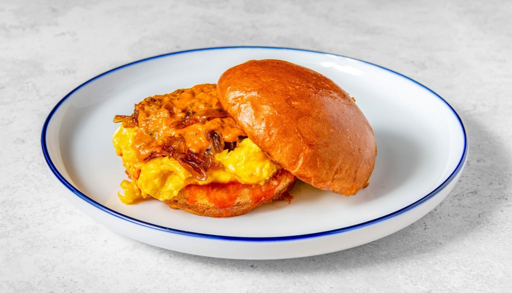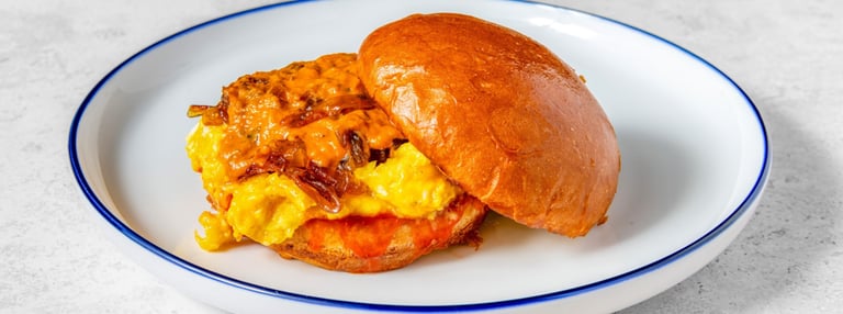 โHarvest Moonโ Brioche bun | cheddar cheese | scrambled fluffy eggs | curry gravy mixed in | caramelized onions | spicy ketchup | & a slice of cheese to top it off!