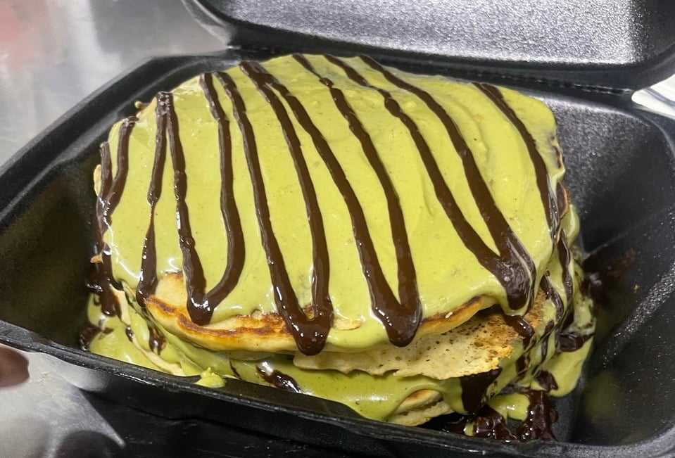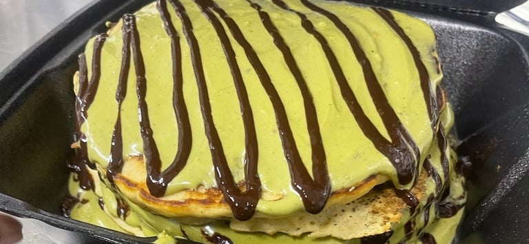Fluffy buttermilk pancakes, with genuine vanilla bean paste, layered with Italian pistachio cream, & warm melted chocolate. Syrup on side (on request). Theyโre an irresistible treat to elevate any occasion.