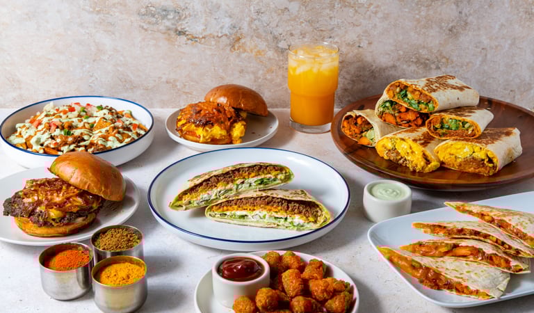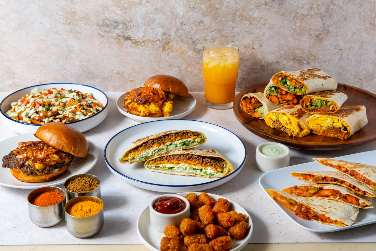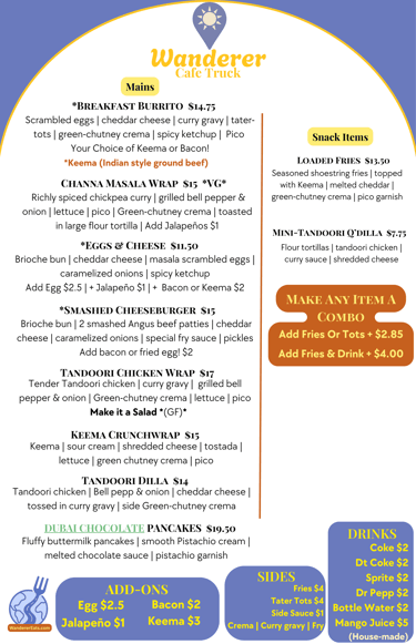 Your choice of Keema or Bacon โ with Scrambled fluffy eggs, melty cheddar cheese, curry gravy, tater-tots, pico, our green-chutney crema, & spicy ketchup. Wrapped and toasted in a large flour tortilla.