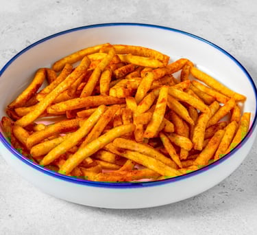 Golden, Yummy, Shoestring fries with a quick toss in Lawrys salt & Indian masala spices!