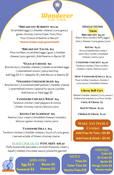 3 flour tortillas, scrambled fluffy eggs, guac, cheddar cheese, pico garnish. Add Keema or Bacon, etc. for upgrade $
