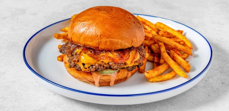 Fluffy Brioche bun, 2 smashed angus-beef patties, cheddar cheese, caramelized onions, fresh-cut pickle chips, and our special fry sauce. (Our Beef is marinated in a delicious rare spice blend!)