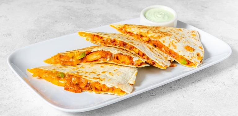 A fusion quesadilla filled with succulent tandoori chicken, complemented by curry gravy & vibrant spices, bell peppers and onion blend, encased in a perfectly grilled, cheddar cheesy large tortilla. Served with side of our Green-chutney crema.