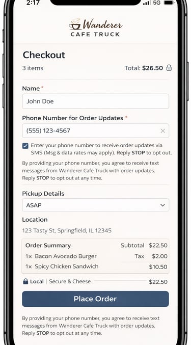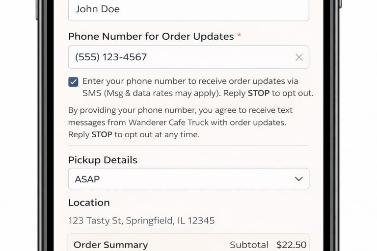 No marketing messages will be sent. And this system is only for purpose of notifying when your order in ready for pickup at window. Consent is voluntary and can be waived upon ordering, or stopped with “STOP” text response. Thank you.