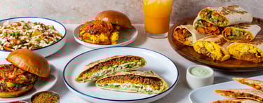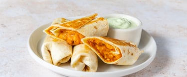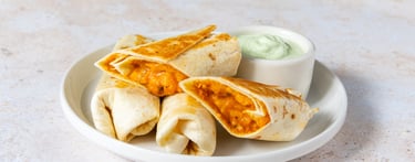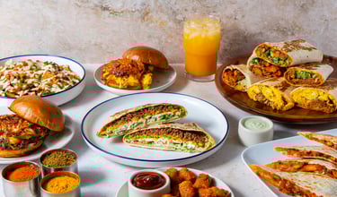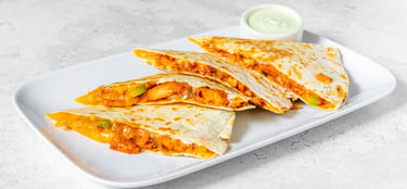 A fusion quesadilla filled with succulent tandoori chicken, complemented by curry gravy & vibrant spices, bell peppers and onion blend, encased in a perfectly grilled, cheddar cheesy large tortilla. Served with side of our Green-chutney crema.