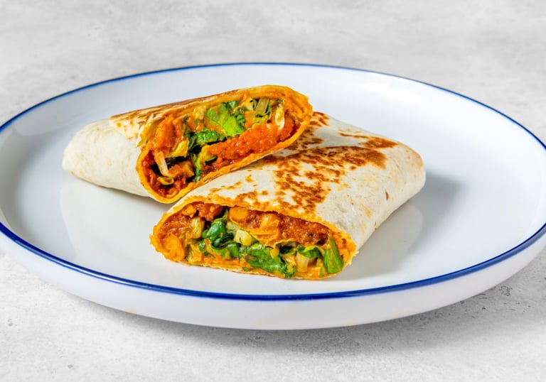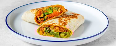 The Channa Masala Wrap offers a flavorful blend of spiced chickpea curry, grilled bell peppers & onions, wrapped in a large tortilla with fresh-cut romaine lettuce, pico, & our green chutney crema. Toasted to golden. A healthy, vegetarian, and vegan-friendly option. Perfectly filling, and satisfying meal on the go.