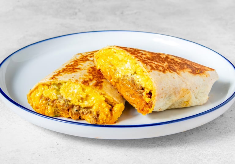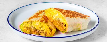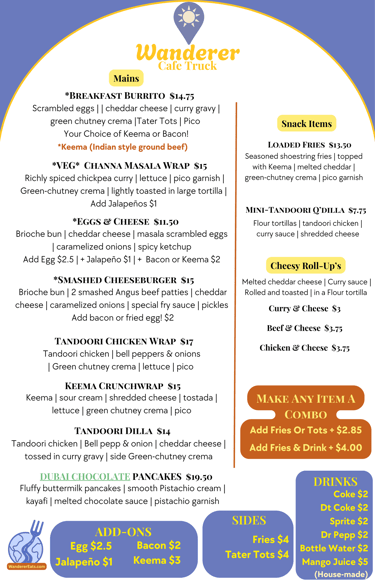 Your choice of Keema or Bacon — with Scrambled fluffy eggs, melty cheddar cheese, curry gravy, tater-tots, pico, our green-chutney crema, & spicy ketchup. Wrapped and toasted in a large flour tortilla.