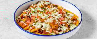 Loaded shoestring fries, with creamy melted cheddar cheese, Keema (Indian-style ground beef), curry gravy, pico, & green-chutney crema drizzled on top.