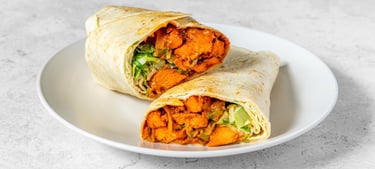 Tender, flavor packed tandoori-chicken, cooked into curry gravy, in a Large tortilla, grilled bell peppers & onions, wrapped with fresh-cut lettuce, pico, and our house green-chutney crema sauce, lightly toasted.