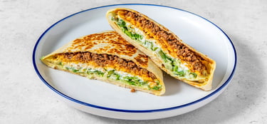 The Keema Crunchwrap features our signature Indian-style ground beef, cheddar cheese melted inside, wrapped in a toasted outer shell, complemented by a sour cream tostada and green-chutney crema, fresh-cut lettuce, and pico. The favorite!