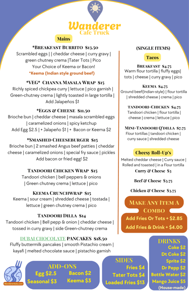 Your choice of Keema, Bacon, or Avocado - with Scrambled fluffy eggs, melty cheddar cheese, curry gravy, tater-tots, green-chutney crema.