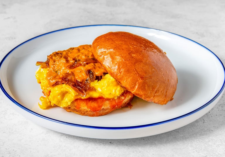 ‘Harvest Moon’ Brioche bun | cheddar cheese | scrambled fluffy eggs | curry gravy mixed in | caramelized onions | spicy ketchup | & a slice of cheese to top it off!